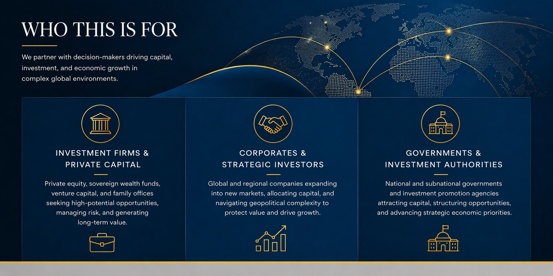 We support the structuring and positioning of cross-border investments, navigating jurisdictional complexities, regulatory constraints and geopolitical considerations to enable efficient and compliant deployment of capital.