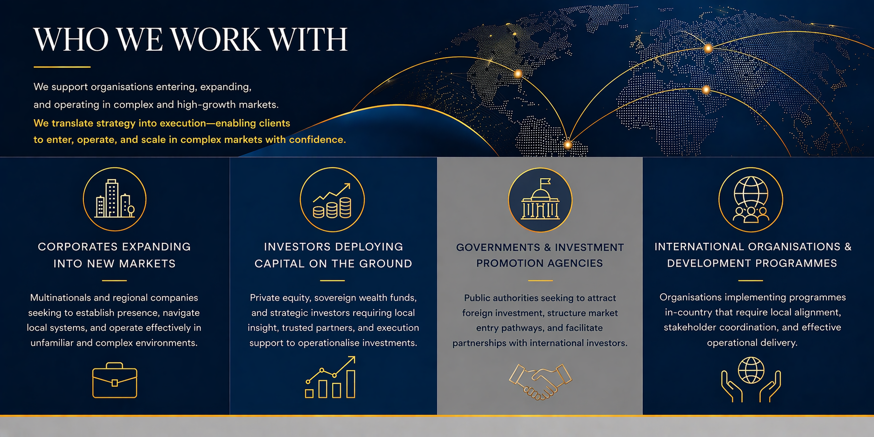 We support clients in navigating legal, regulatory, and institutional frameworks, ensuring compliance while enabling efficient and timely market entry.